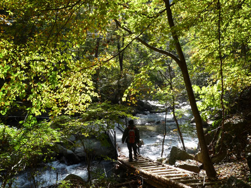 木橋を渡って水の流れを眺めます