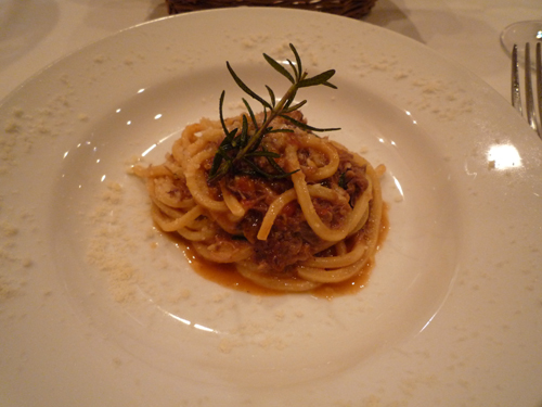断面の四角い自家製パスタ キタッラ 仏産鴨のラグーソース